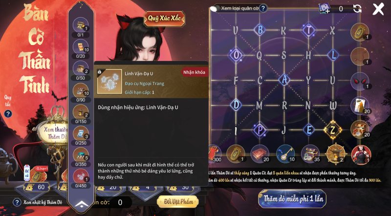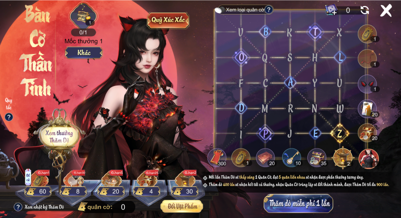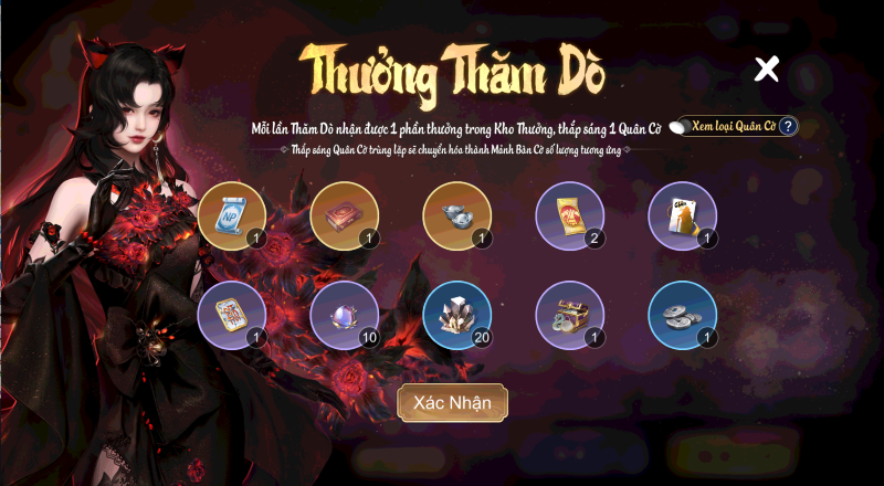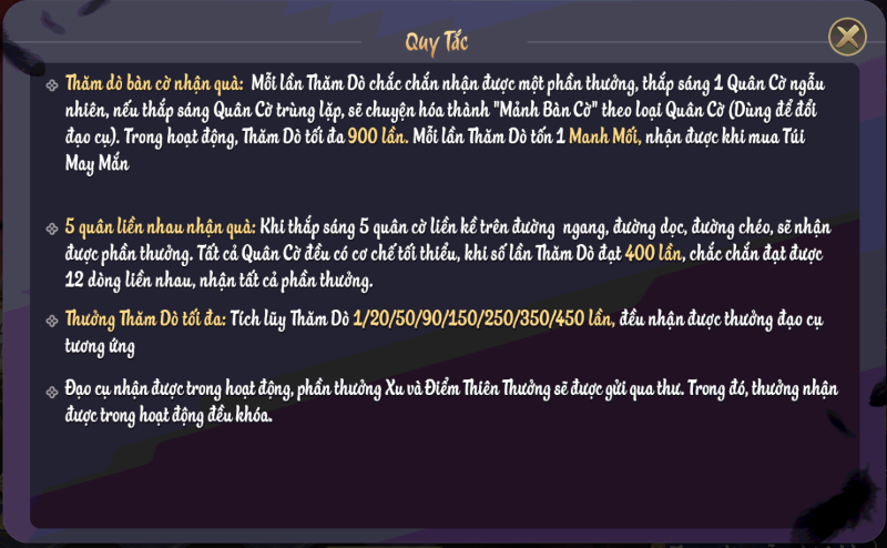 • Thăm dò bàn cờ → Mở các quân cờ → Nhận thưởng tương ứng và mở khóa ô cờ đó.